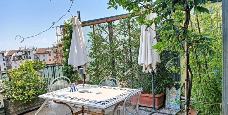 L’attico si apre su un ingresso che conduce a un accogliente soggiorno con accesso a un ampio terrazzo panoramico, perfetto per momenti di relax e convivialità all’aperto. Il cucinotto è funzionale e ben organizzato, mentre la camera da letto dispone di un proprio balcone. L’immobile è parzialmente arredato e dotato di riscaldamento centralizzato, aria condizionata, videocitofono, infissi nuovi e pavimento in parquet. Completa la soluzione un bagno finestrato con box doccia.